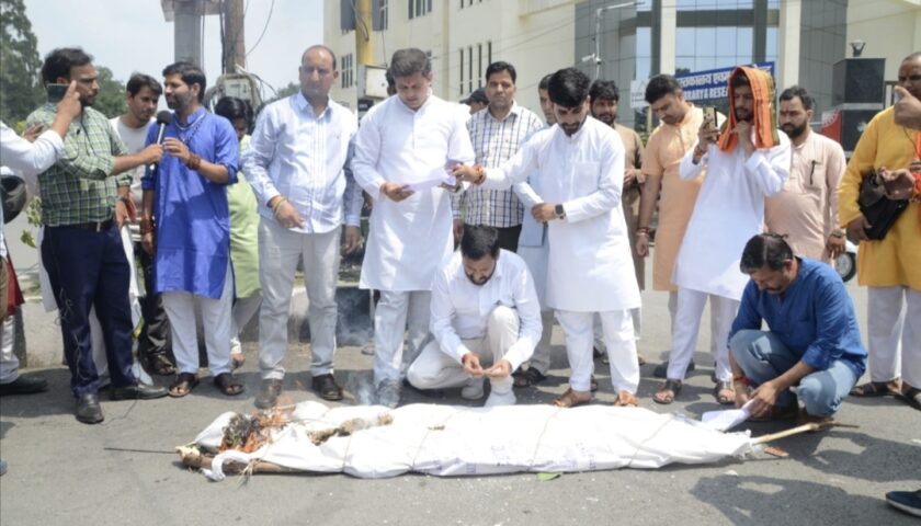 देहरादून -देहरादून में आज पर्वतजन फाउंडेशन के आवाह्न पर एकत्र हुए ब्राह्मण समाज के तमाम लोगों ने आज देहरादून के परेड ग्राउंड से लैंसडाउन चौक तक पुण्यानंद गिरी के पुतले की शव यात्रा निकाली और लैंसडाउन चौक उसे आग के हवाले कर दिया।