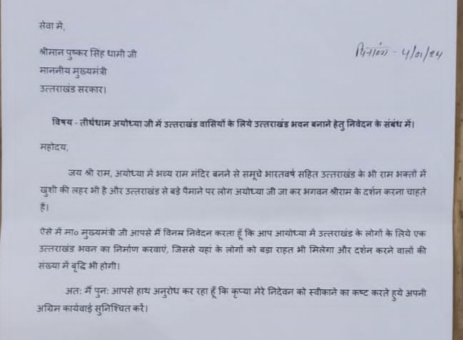 इस पत्र में स्वप्निल ने सीएम धामी से अनुरोध किया कि उत्तराखंड से अयोध्या जाने वाले राम भक्तों की सुविधा को देखते हुये उत्तराखंड़ सरकार को एक भव्य भवन उत्तराखड़ वासियों के लिये बनाना ही चाहिए।
