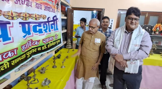 इस प्रदर्शनी में समस्त दीपक श्रीमती संध्या पुरवार व डा हरीमोहन पुरवार के निजी संग्रह से प्रस्तुत किए गए।प्रदर्शनी उद्घाटन के समय डॉक्टर हरीमोहन पुरवार व संस्कार भारती के अध्यक्ष कीर्ति कुमार दीक्षित ने मुख्य अतिथि को अंग वस्त्र उढाकर उनका स्वागत किया ।