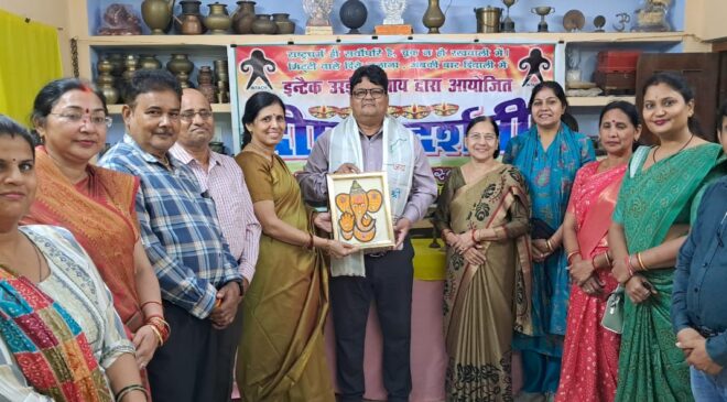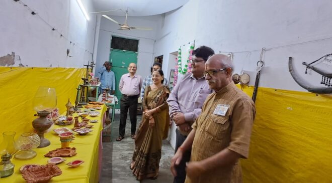 उरई (जालौन)-दीपावली के महा महोत्सव के उपलक्ष में इन्टैक उरई अध्याय, संस्कार भारती जालौन और भारत विकास परिषद स्वामी विवेकानंद शाखा उरई के संयुक्त तत्वावधान में चूड़ी वाली गली स्थित श्रीमती संध्या पुरवार के निज निवास पर शंख ध्वनि के मध्य जनप्रिय जिला पंचायत राज अधिकारी राम अयोध्या प्रसाद गुप्त ने प्रथम पूज्य श्री गणेश जी की प्रतिमा के समक्ष दीप प्रज्वलित कर के प्रदर्शनी का उद्घाटन किया ।