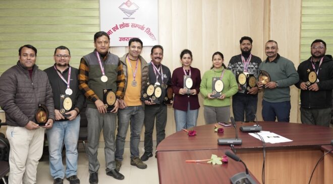कैरम प्रतियोगिता के डबल्स श्रेणी में विजेता अतुल डिमरी एवं गजेन्द्र सिंह, उप विजेता चेतन कुमार पाण्डेय एवं राम सिंह परजोली को पुरस्कृत किया गया। यह खेल प्रतियोगिता विगत 12 एवं 14 दिसम्बर, 2025 को सूचना भवन सभागार में आयोजित की गई थी। इस अवसर पर संघ के समस्त पदाधिकारीगण एवं कर्मचारीगण उपस्थित थे।