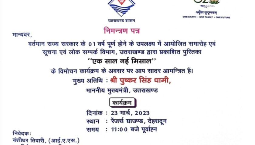 महानिदेशक सूचना वंशीधर तिवारी जी ने बताया कि राज्य सरकार का एक वर्ष पूर्ण होने पर प्रदेश स्तर पर गुरुवार 23 मार्च 2023 को “जन सेवा” के कार्यक्रम आयोजित किया जा रहा है। देहरादून के रेंजर्स ग्रांउण्ड में मुख्य कार्यक्रम आयोजित किए जाएंगे, जिसमें माननीय मुख्यमंत्री श्री पुष्कर सिंह धामी प्रदेशवासियों को सम्बोधित करेंगे तथा सूचना विभाग द्वारा प्रकाशित विकास पुस्तिका “एक साल-नई मिसाल” का विमोचन करेगे।
