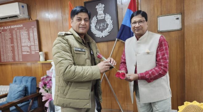 देहरादून -लघु समाचारपत्र एसोसिएशन ने नवागंतुक वरिष्ठ अधिकारियों के स्वागत की परम्परा के क्रम में आज नवागंतुक पुलिस कप्तान प्रमेन्द्र डोभाल से शिष्टाचार भेंट कर उनका जोरदार स्वागत किया गया।