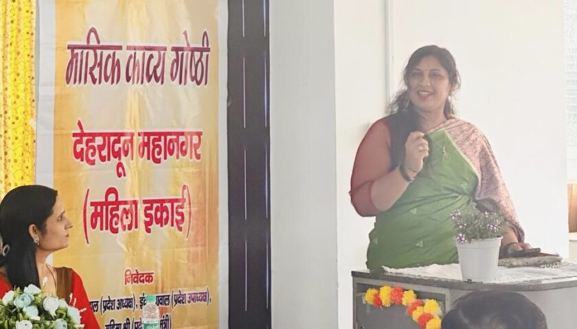 देहरादून- राष्ट्रीय कवि संगम’ महानगर महिला इकाई देहरादून के तत्वावधान में प्रथम मासिक काव्य गोष्ठी महिला दिवस के उपलक्ष्य मे राष्ट्रीय कवि संगम की नवनियुक्त अध्यक्ष “मीरा नवेली जी”की अध्यक्षता में पैसिफिक गोल्फ के सभागार में आयोजित की गई। मुख्य अतिथि वरिष्ठ साहित्यकार श्रीमती डॉली डबराल जी द्वारा मंच सुशोभित रहा। विशिष्ठ अतिथि राष्ट्रीय कवि संगम की प्रदेश महामंत्री श्री मती महिमा जी रहीं